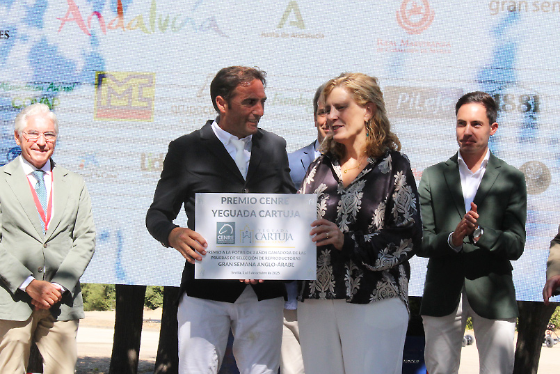 Albert Hermoso recoge en nombre de Almenara Alta el premio de CENRE-Yeguada Cartuja de manos de Judit Anda.