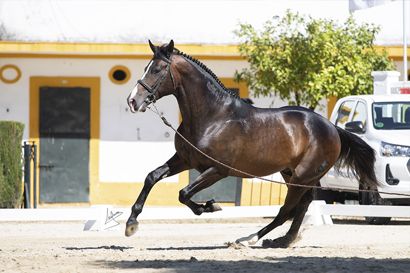 Aunque fuera de premio por pertenecer a la sección IV de nuestro libro, presentó José Manuel Carranco a este ejemplar de su yeguada, hijo de Kerry-Gold 8,39% y Dentinaria 1,56% por Nauplión. El castaño de tres años, hizo las delicias de los aficionados presentes de la mano de Javier Gálvez Rubio. Fotos de Azahara Pérez.