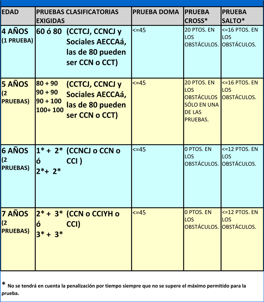 El reglamento del ciclo de este año no presenta grandes novedades, con unos requisitos en cada edad para estar en la Final prácticamente iguales a los de 2025: los ejemplares de cuatro años necesitarán una nota mínima en una prueba de nivel 60 u 80, y los de cinco, seis y siete años, en dos pruebas clasificatorias, en los dos últimos casos sin penalizaciones en el Cross. En este cuadro se pueden ver los mínimos para clasificar:
