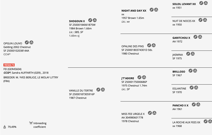 Tanto Shogun II como Vanille du Tertre, los dos progenitores de este magnífico eventer, en cuyo palmarés destaca el Campeonato del Mundo de 2014, actualmente serían considerados e inscritos como Anglo-árabes (Sec. III).